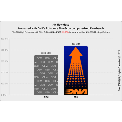 The DNA filter will also smoothen out the air flow stream, as it passes through the filter, reducing turbulence and sending smooth clean & fresh air towards the engine intake, increasing torque and power. Additionally to the high air flow, smooth and unified air flow is very important. This explains why we see a decrease in the power output when testing a bike or car on the dyno "without" a filter as the circulation of the air in the air box is disturbed and the result is turbulence and low power output.